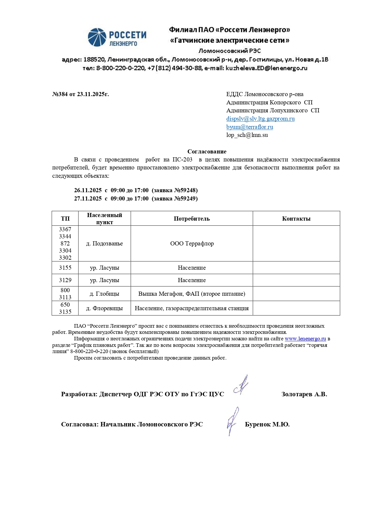 ВНИМАНИЕ : Отключение электроэнергии 26.11.2025 г. Опубликовано 24.11.2025 в рубрике Новости Cкачать: Согласование №384 ЛРЭС ГтЭС (ПС-203 Ф-1 на 26 и 27 .11.2025)_page-0001